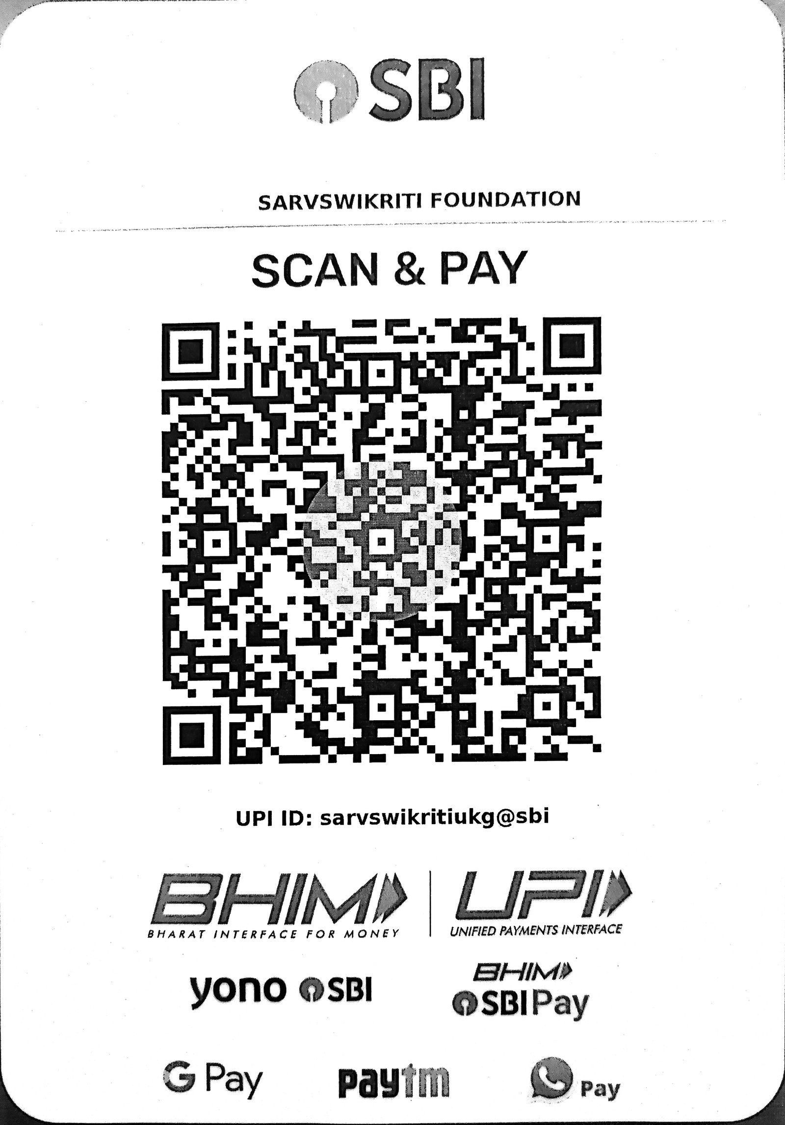 Bank Detail - Bank Name : State Bank Of India Holder Name : Sarvswikriti Foundation Account No. : 44046501972 IFSC Code : SBIN0004525 Branch : UDA-KISHUNGANJ